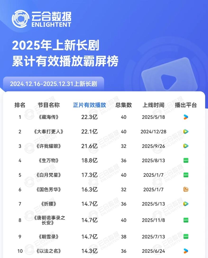 和2024年相比,2025年的爆款剧明显“含金量”不足。云合数据显示,双平台认证的年度爆款《藏海传》有效播放量为22.3亿,而2024年的“剧王”《庆余年2》有效播放量高达45.1亿,差距一目了然。