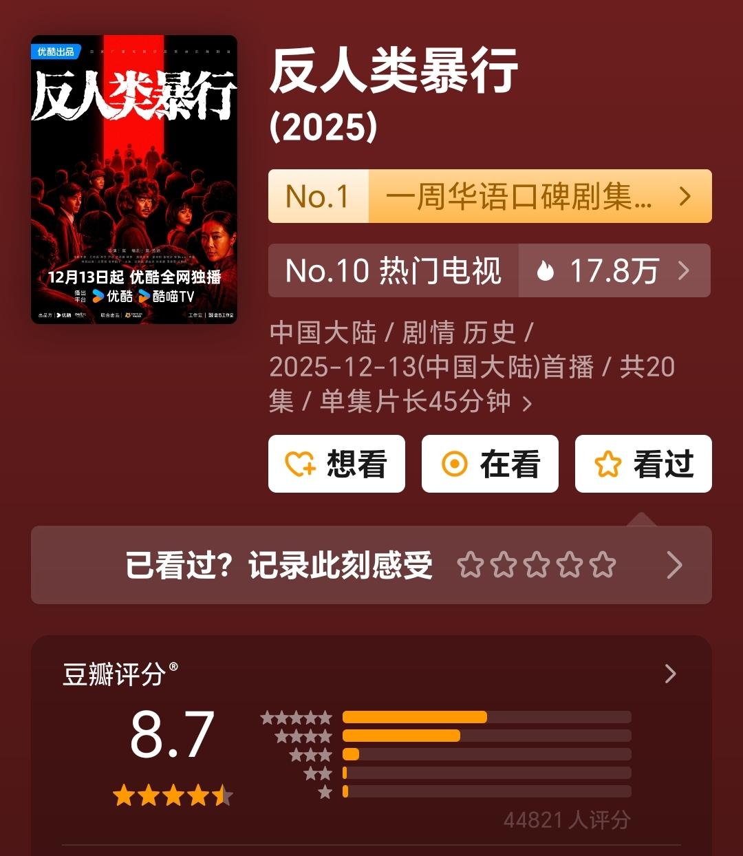 更值得关注的是,观众似乎正在加速逃离长剧集。曾经的现象级作品,往往坐拥百万级的豆瓣评分人数——《漫长的季节》有110.6万人评分,《觉醒年代》有53.7万人评分,《狂飙》的评分人数也突破百万。反观2025年评分最高的《反人类暴行》,评分人数仅4万余人,年度高分剧无论在口碑传播度还是大众破圈能力上,都与过往的爆款存在明显差距。