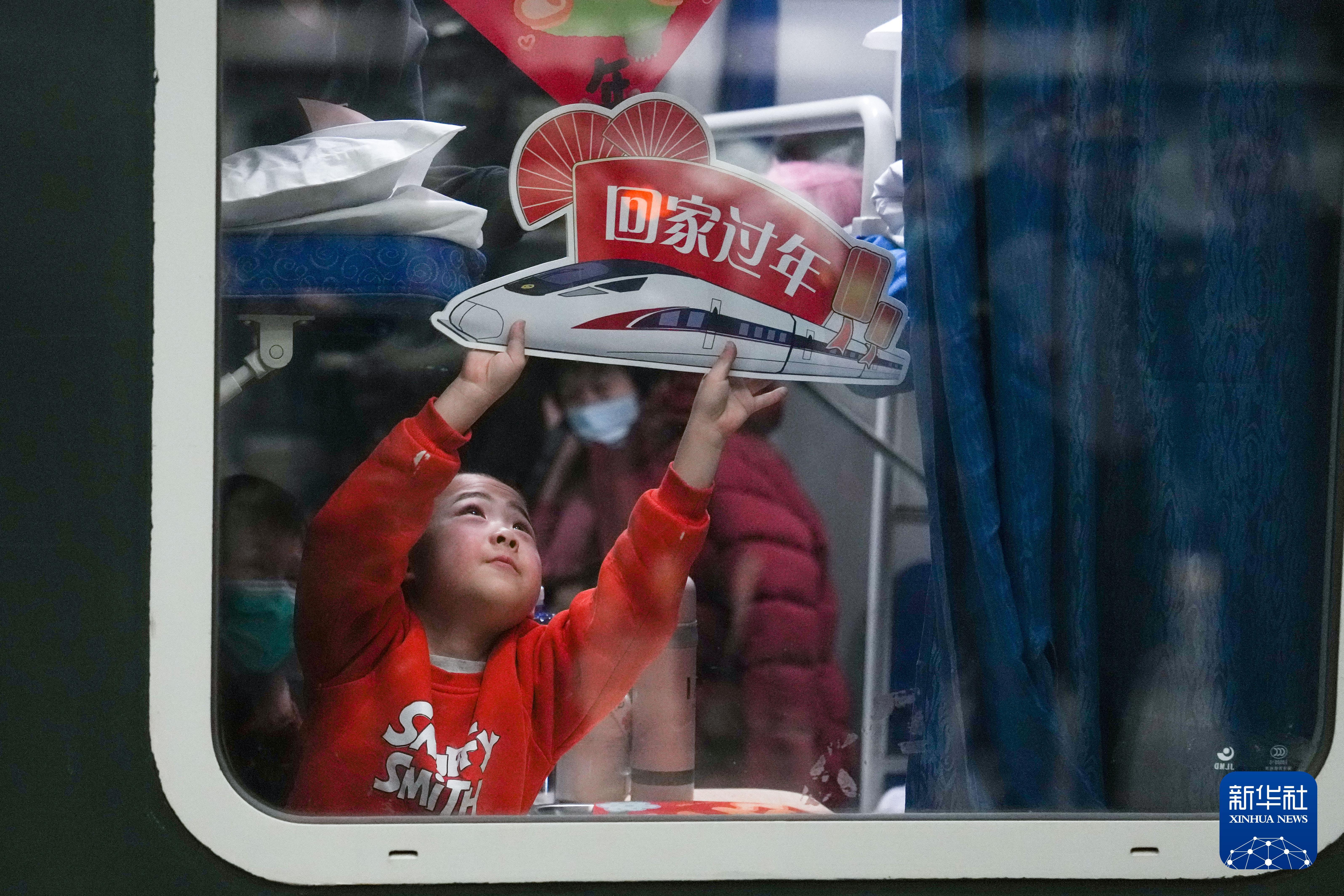 2025年1月13日,在北京地区春运首趟旅客列车发车前,一名小乘客拿着“回家过年”的标牌在车厢内玩耍。 新华社记者 鞠焕宗 摄