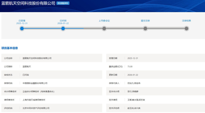 一石激起千层浪,一则看似普通的交易所公告,将一家民营商业航天企业推至公众视野的中心。1月22日,上交所官网信息显示九鼎,蓝箭航天空间科技股份有限公司在科创板的IPO审核状态正式更新为“已问询”。这不仅标志着一家高科技企业的资本化进程迈出了关键一步,更在中国“向天图强”的宏大叙事中,刻下了一枚具有战略意义的里程碑。从受理到问询,短短二十余天,市场期待的背后,是中国商业航天力量从蓄势待发到崭露头角的生动缩影。