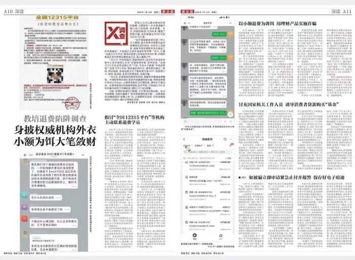 原本以为可以拿回教培机构的退费,没想到却一步步掉进骗子精心设计的陷阱,损失惨重。近日,近期,新京报针对假冒“全国12315平台”等机构主动联系退费学员、用理财产品等新型诈骗予以曝光腾思控股,甚至有学员(家长)先后被骗走6000元到30000元不等。