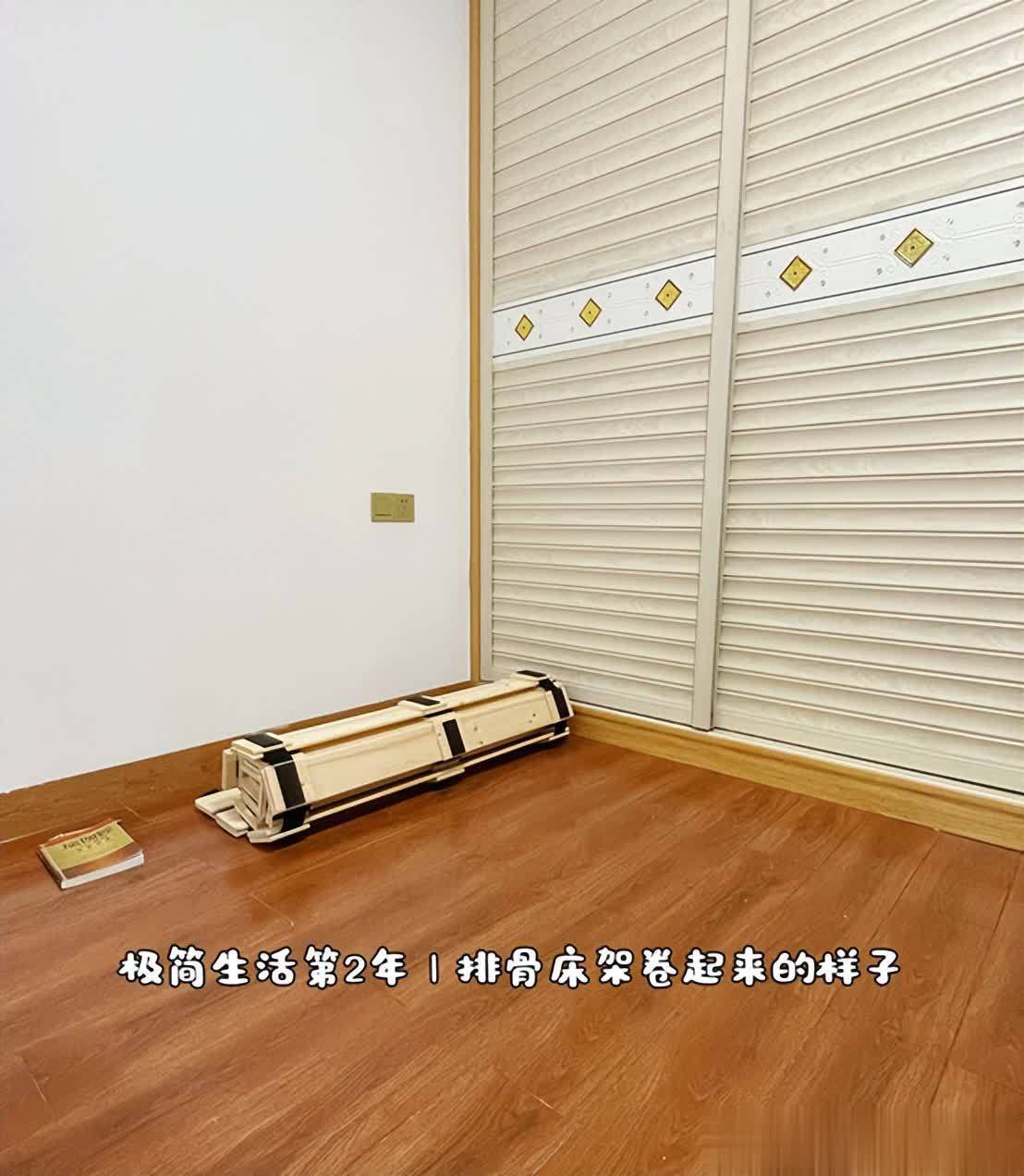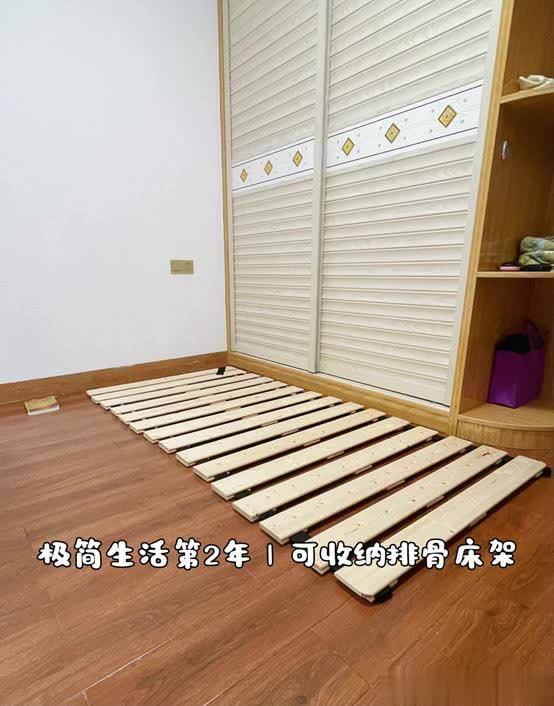 他就只准备了一个能够收纳起来的排骨床架,平时晚上睡觉的时候直接将床架放在地板上铺上被子就可以了。