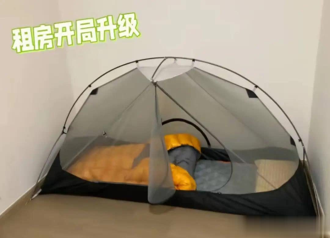 前一位朋友至少还买了一个能够收纳的排骨床架,而这位朋友就只是准备了一个简单的帐篷,平时晚上就直接睡在帐篷里面。